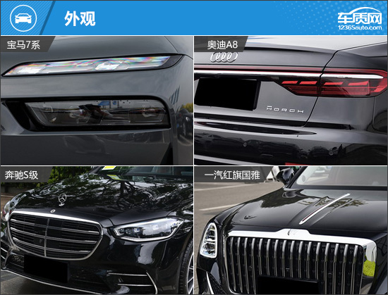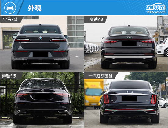 车尾方面,四款车型都采用大气、稳重的设计风格,并通过简洁线条的应用,带来力量感的提升。除了奥迪A8之外,另外三款车型均未采用贯穿式尾灯组,但奔驰S级通过镀铬装饰条将两侧尾灯组连接起来,以增强整体感。红旗国雅尾灯组采用纵向设置,设计灵感源于宫灯,整体造型与车头形成呼应。