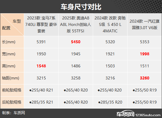 车身尺寸方面,从数据上看,红旗国雅整体表现相对更好,在轴距和车身宽度两方面占优,奥迪A8和宝马7系则分别在车身长度和车身高度方面占优。相比之下,奔驰S级要逊色不少,数据层面没有突出的亮点。虽然四款车型在车身尺寸方面表现不尽相同,但因为都是大型车且轴距超过3200mm,车内空间表现可以让目标客户满意。此外,宝马7系配备了21英寸轮毂,视觉效果更显大气;相比之下,红旗国雅的19英寸轮毂则略显吝啬。