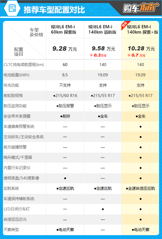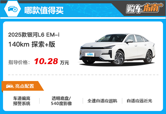 综合来看,推荐的2025款吉利银河L6 EM-i 140km 探索+版的性价比最高,总体配置也足够日常使用,消费者在购买时可优先考虑。