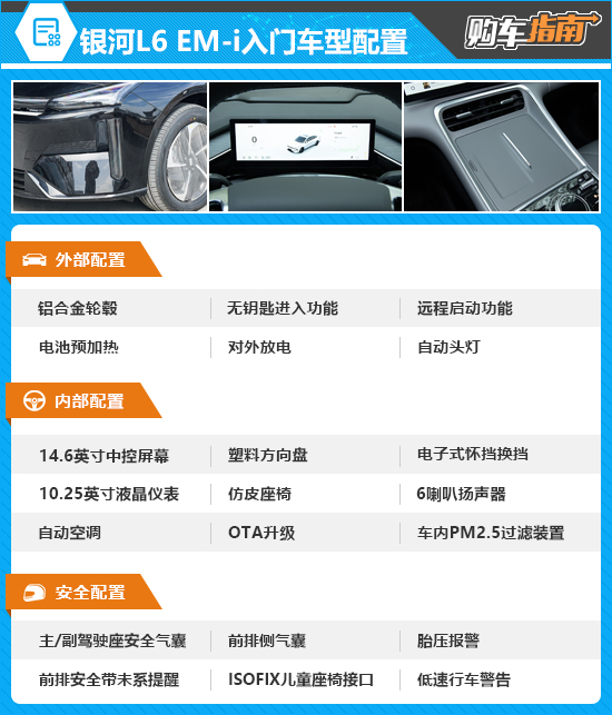 2025款吉利银河L6 EM-i的入门车型指导价为8.28万元,从该配置车型来看,其配置表现较为丰富,提供无钥匙进入功能、电池预加热、对外放电、自动头灯、仿皮座椅、自动空调以及胎压报警等配置。从日常用车的角度来考虑,已能满足基础的代步需求,但部分实用性和舒适性配置有缺失,故并不推荐此配置车型。