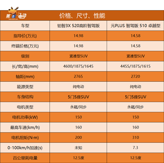 两款车型的定位、续航、价格都高度重叠,所以我们选取了铂智3X 520高阶智驾版和元PLUS 智驾版 510 卓越型来做个对比,因为两者的价格相当而且带高阶智驾。