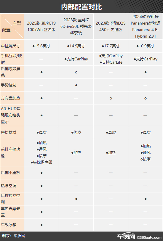 内部配置方面,依旧是蔚来ET9最为出众,配备了独有的AR-HUD增强现实抬头显示、前排座椅头枕扬声器、后排小桌板、热泵空调、车内香氛装置以及车载冰箱,整体表现更符合行政D级车定位。其余三款车型虽然没有配备太多特色功能,但均支持CarPlay互联,对于苹果用户比较友好。