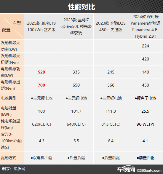 动力方面,由于保时捷Panamera新能源为插电式混合动力车型,因此其动力参数无法与其他三款车型直接对比,但从官方公布的0-100km/h加速时间来看,保时捷Panamera新能源加速表现最为出众;从其他三款纯电车型来看,蔚来ET9是唯一采用双电机的车型,电动机总功率和总扭矩均最为出色,纯电续航里程方面则是奔驰EQS更有优势。