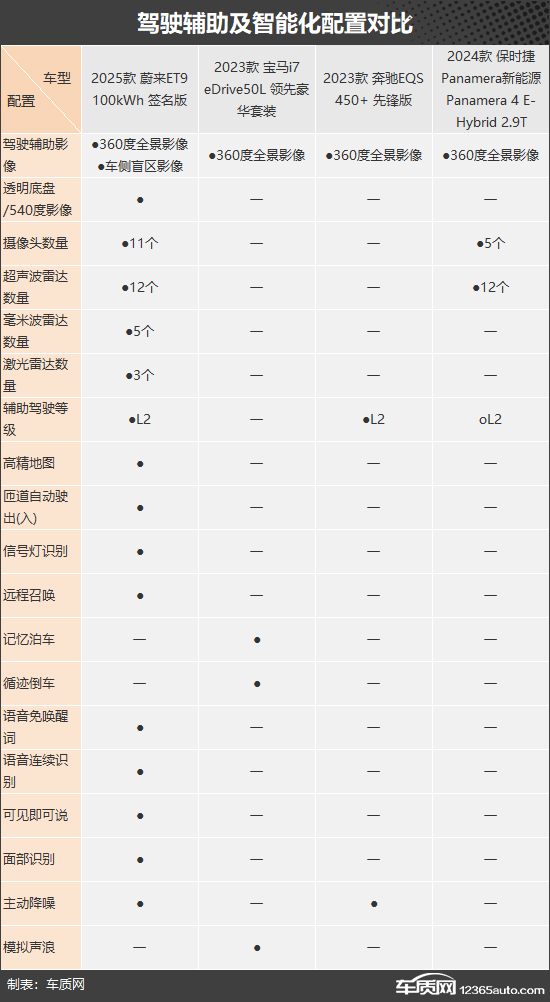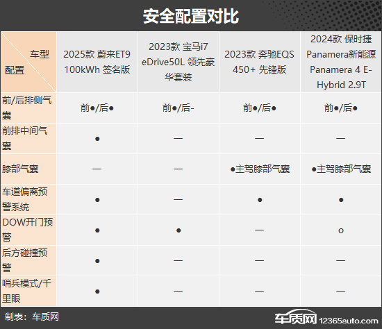 安全配置方面,蔚来ET9配备了独有的前排中间气囊、后方碰撞预警以及哨兵模式/千里眼,安全性更高。奔驰EQS和保时捷Panamera新能源则均配备了主驾膝部气囊,对驾驶者安全保护更加到位。宝马i7整体表现稍显落后,并且是唯一没有配备后排侧气囊的车型。