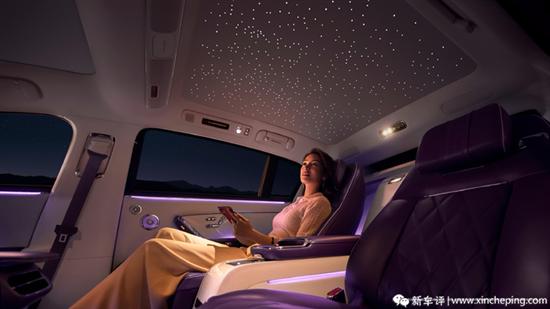 此外,座舱中部还可以选装升降式屏幕,从而让车内前后排形成隔断,为后排乘客提供更加私密的空间环境。并且,后排还配有小桌板、香槟杯和星空顶等奢华配置,营造出如同豪华头等舱的乘坐感受。