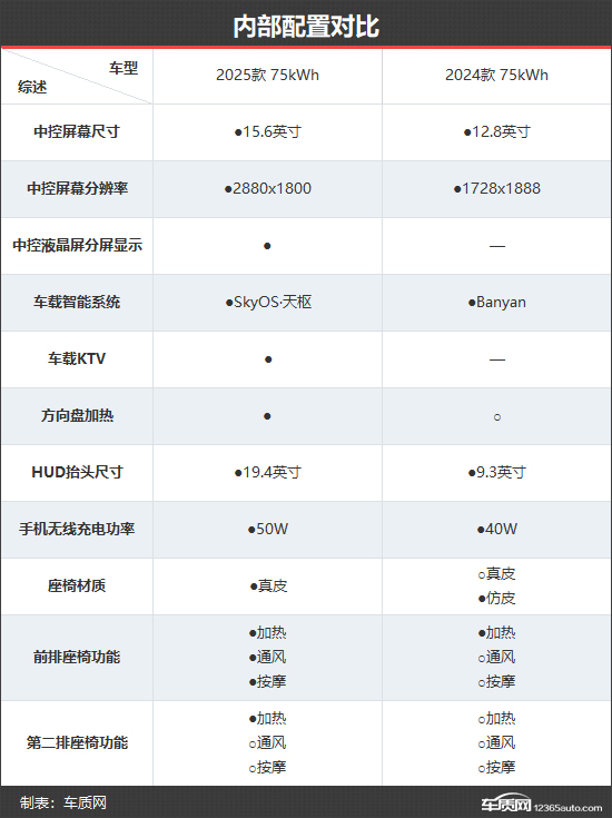 内部配置方面,除了刚才提到的中控屏,新款车型的车机还搭载SkyOS·天枢车载智能系统,并增加了车载KTV功能,拥有更为出色的使用体验。此外,新款车型的座椅材质由老款车型的仿皮升级为真皮,同时还标配了前排座椅通风/按摩以及第二排座椅加热功能,乘坐舒适性得到显著提升。
