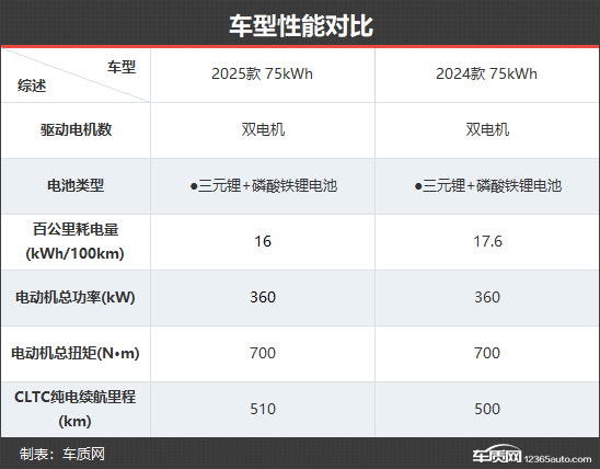 动力方面,新款车型保持不变,依旧搭载双电机,电动机总功率360kW,电动机总扭矩700N·m。续航方面,新款车型的CLTC纯电续航里程增加了10km,并且百公里电耗量也降低至16kWh/100km。