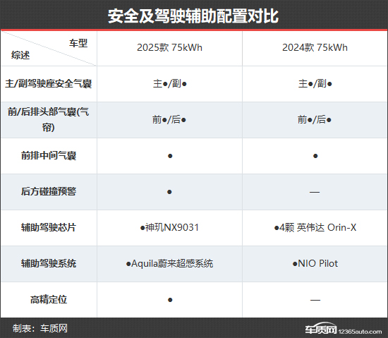 安全配置方面,新款车型依旧配备了丰富的主/被动安全配置,并且还增加了后方碰撞预警。新款车型的驾驶辅助配置也同样得到提升,搭载了全球首颗车规5nm辅助驾驶芯片神玑NX9031,并配备Aquila蔚来超感辅助驾驶系统,再加上新增的高精定位,拥有更轻松愉悦的点到点出行体验。