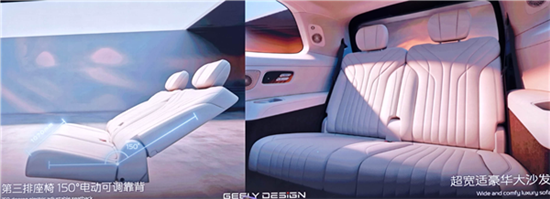 车内为六座布局,提供二三排纯平地板、二排吸顶屏、180mm车内通道、三排靠背150度电动调节以及大尺寸后舷窗。