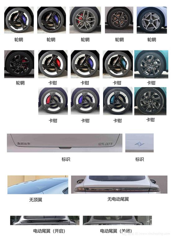 配置选装方面,eπ007提供多样化的个性定制选项,包括不同样式的轮圈、多色刹车卡钳、特殊标识、顶翼以及电动尾翼等,满足消费者对个性化的需求。