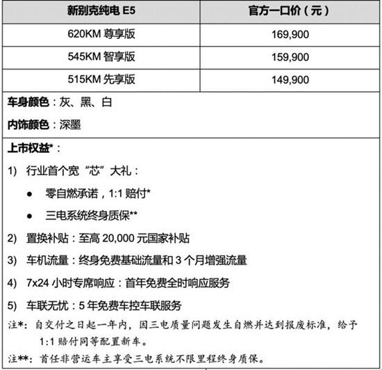 别克品牌宣布:越级质享大五座SUV——新别克纯电E5焕新上市,共推出3款车型,官方一口价分别为:620KM尊享版 16.99万元,545KM智享版 15.99万元,515KM先享版 14.99万元;并推出丰厚的上市权益,其中行业首个宽“芯”大礼,包含1:1赔付的“零自燃”承诺,以及三电终身质保等重磅回馈;叠加至高20,000元置换补贴、免费车机流量和车联服务等诚意好礼,让消费者购车用车全无后顾之忧,为油车老司机换购电车带来“大可放宽心”的理想选择。