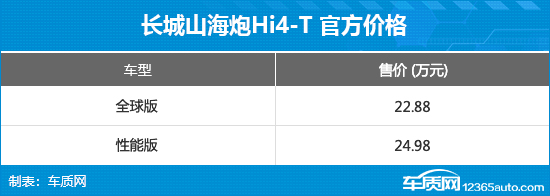 6月23日,长城山海炮Hi4-T正式上市,新车共推出2款车型,官方售价区间为22.88-24.98万元。同时,官方还推出限时礼、置换礼、老友礼等七重上市权益。
