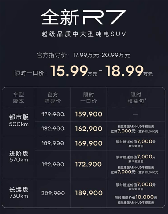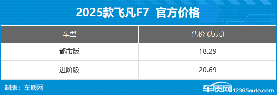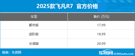 6月26日,2025款飞凡R7正式上市,新车推出3款车型,售价区间17.99-20.99万元,限时一口价为15.99-18.99万元。