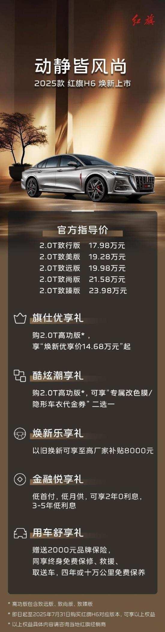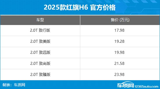 6月27日,2025款红旗H6正式上市,新车共推出5款车型,售价区间为17.98-23.98万元。同时,官方还推出了多重购车权益,包括以旧换新至高8000元厂家补贴等。