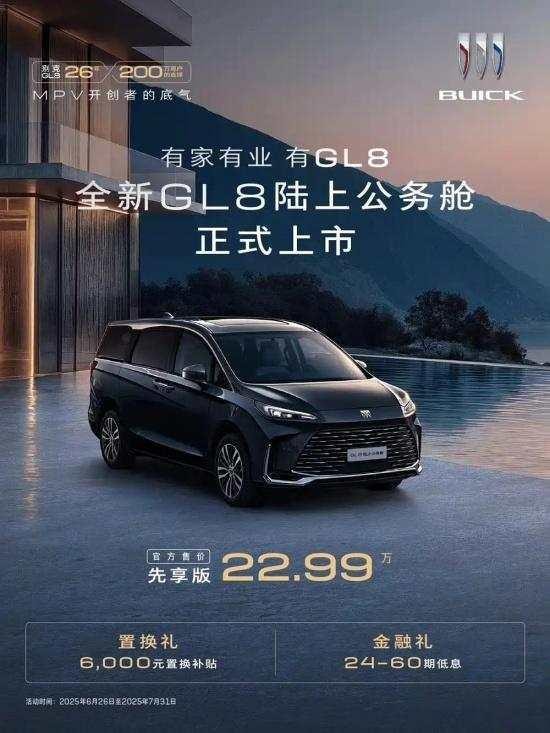 6月26日,上汽通用别克官方宣布旗下全新GL8陆上公务舱正式上市,新车仅推出1款车型,售价为22.99万元。同时,官方还表示即日起至2025年7月31日,购车还可享受24-60期低息的金融礼,以及至高6000元置换补贴。