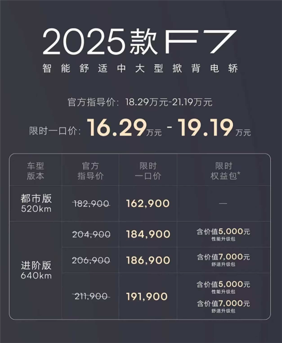 6月26日,2025款飞凡F7正式上市,新车共推出4款配置,指导售价区间为18.29-21.19万,限时一口价为16.29-19.19万元。