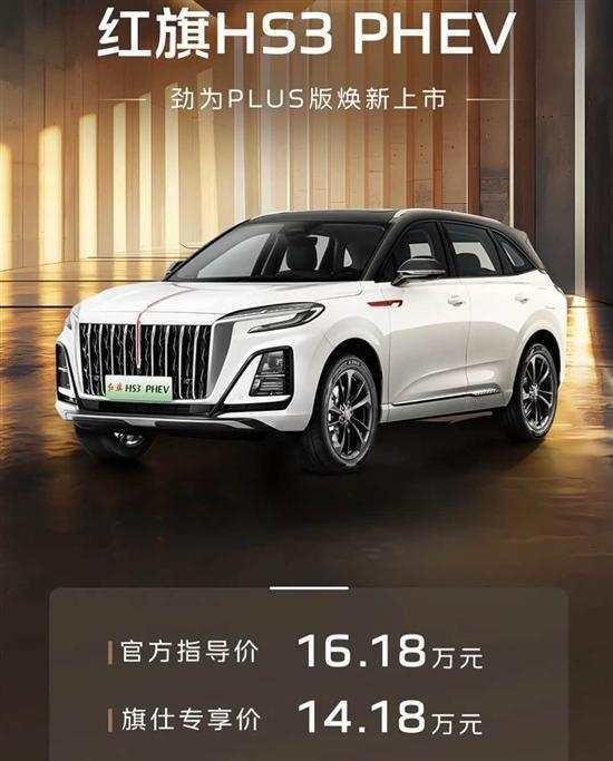6月27日,红旗HS3 PHEV劲为PLUS版正式上市,新车推出1款车型,官方指导价16.18万元,旗仕专享价14.18万元。新车搭载1.5T插电混动系统,综合续航可达1420km。
