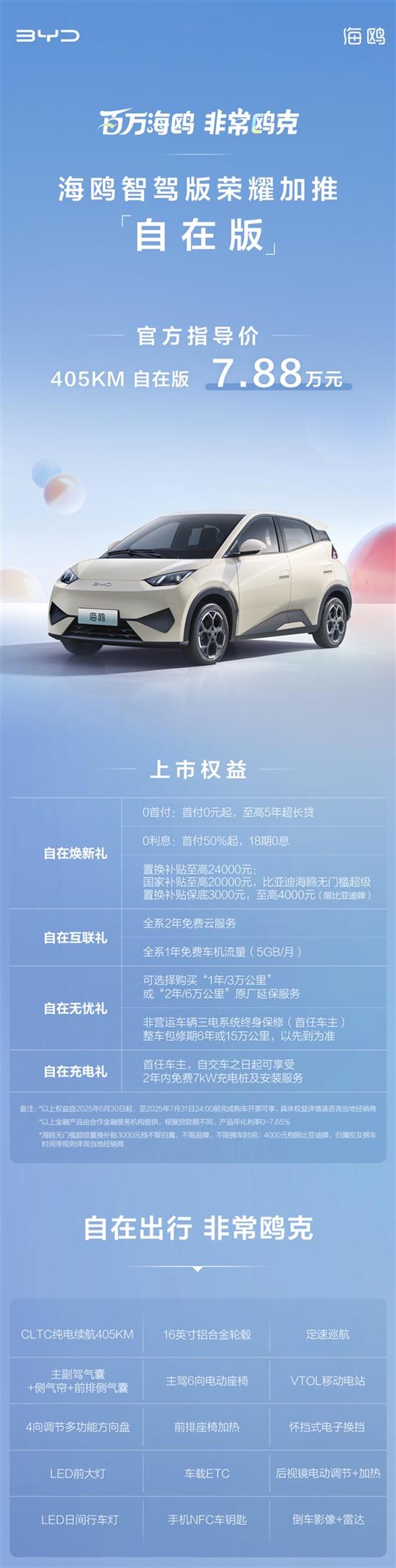 同时,海鸥智驾版自在版今日晚间也正式上市,共推出1款配置,售价为7.88万元,CLTC纯电续航405km。