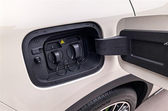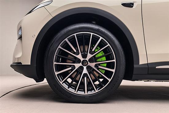 车身侧面,新车采用双色车身和悬浮式车顶的设计,同时上扬的腰线配合轻微的溜背也形成了轿跑SUV的姿态。此外,多幅铝合金轮辋看上去十分的精致,轮胎则选用了规格为255/45 R20的韩泰轮胎,并且实拍车型还配备了绿色刹车卡钳,十分的有个性。