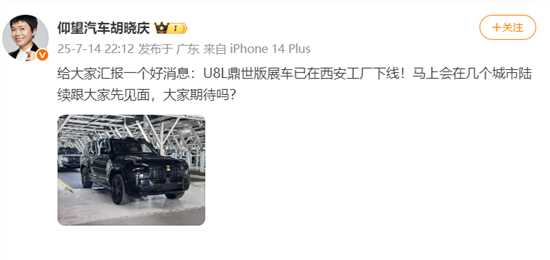 7月15日消息,比亚迪仰望销售事业部总经理胡晓庆发文透露,仰望U8L鼎世版展车已在西安工厂下线,马上会在几个城市陆续跟用户先见面。