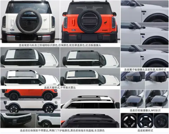 结合官图和申报图来看,福特烈马新能源外观相比在售燃油车型,对车头进行重新设计,配有全新造型的头灯组,“BRONCO”标识可点亮。