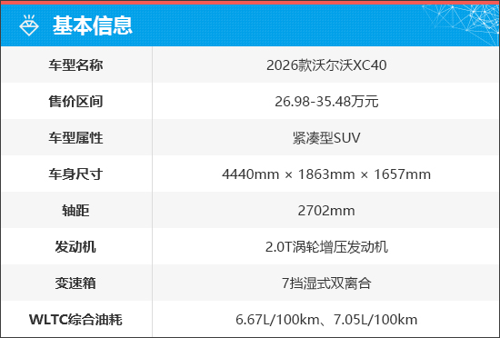 2026款沃尔沃XC40共推出5款车型,售价区间为26.98-35.48万元。新车定位为紧凑型SUV,提供两驱、四驱版本车型。