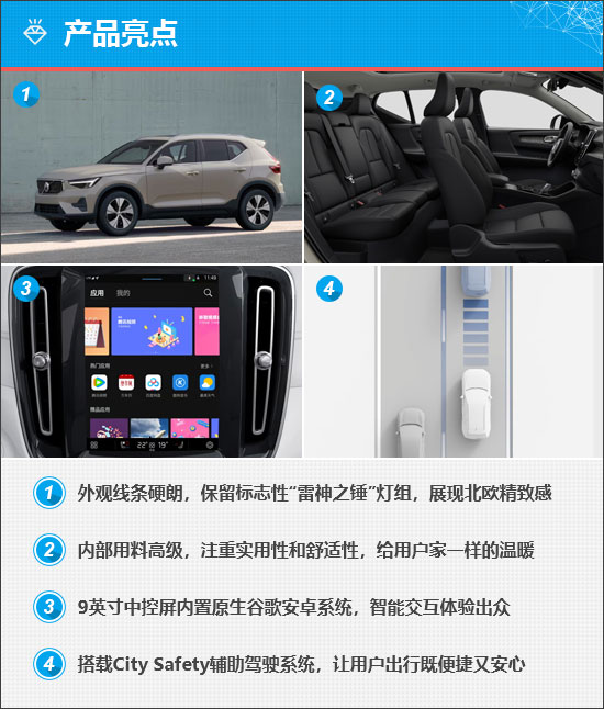 智能交互体验上,2026款沃尔沃XC40的车机内置原生谷歌安卓系统,系统内置高德地图和华为应用商城,界面美观且操作逻辑简单。除此以外,对于苹果用户而言,车辆还支持CarPlay手机互联。