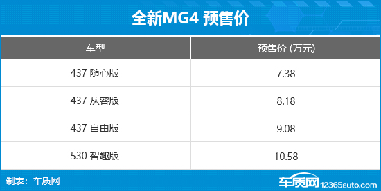 8月5日,全新MG4正式开启预售,共推出4款车型,官方预售价区间为7.38-10.58万元,另外还有一款半固态安芯版车型将于今年9月公布价格。同时,官方还推出订金膨胀抵车价、限时宠粉礼等限时权益。
