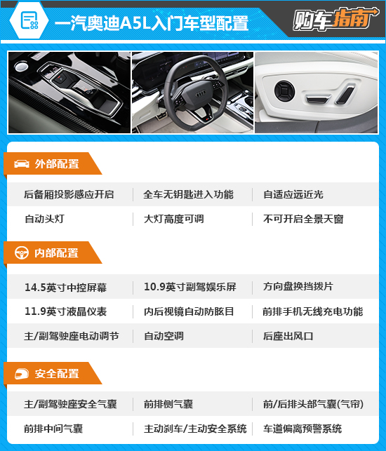 2026款一汽奥迪A5L的入门车型提供了丰富的主/被动安全功能,并且如后备厢投影感应开启、全车无钥匙进入功能、自适应远近光、内后视镜自动防眩目以及自动空调等便利性配置也有所配备,整体表现可圈可点。而此次未推荐,主要是因为还有性价比更高的车型。