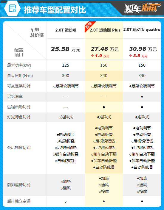 推荐车型与高一级别车型相比,后者运动性能更佳,如悬架软硬调节以及quattro四驱系统,能够实打实提升操控性。此外,其还增加了如记忆泊车等功能,虽然实用性不错,但考虑到与推荐车型相比价格增加了3.5万元,性价比并不高。