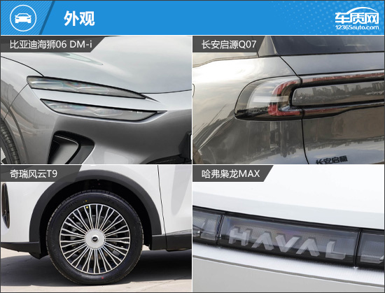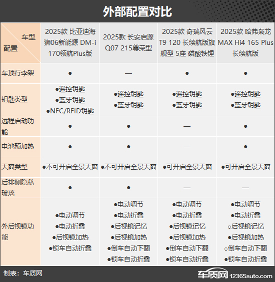 外部配置方面,四款车型整体表现均衡,但在细节上略有差异。比亚迪海狮06 DM-i配置全面,但后视镜功能略显简单;长安启源Q07是唯一未提供车顶行李架的车型;哈弗枭龙MAX与奇瑞风云T9均未配备后排隐私玻璃,而奇瑞风云T9还缺少远程启动及电池预加热功能,整体表现稍显落后。