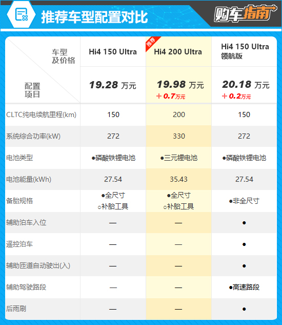 至于Hi4 150 Ultra领航版,其主要优势在于更完善的辅助驾驶功能,且仅比推荐车型贵0.2万元。但考虑到这一配置的受众相对有限,同时在续航与动力方面不及推荐车型,所以更适合对辅助驾驶有明确需求的少数用户。