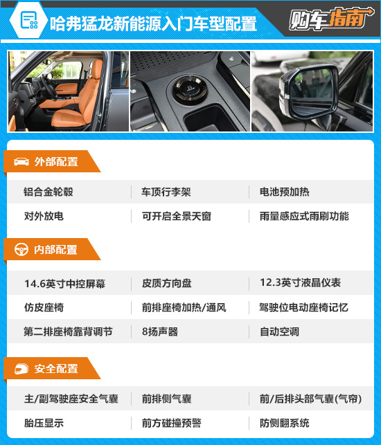 2026款哈弗猛龙新能源的入门车型为Hi4 105 Pro,售价17.38万元,其配置水平较为基础,配备了车顶行李架、对外放电、皮质方向盘、前排座椅加热/通风、前排侧气囊、防侧翻系统等功能。作为一款兼顾多场景使用的SUV车型,其虽能满足代步所需,但纯电续航里程偏短,舒适、便利性功能稍显不足,并未将该车的产品优势体现出来,因此不推荐入门车型。
