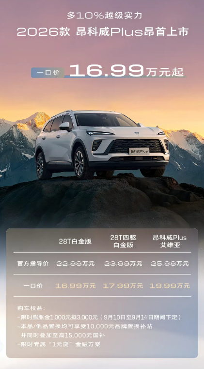 9月10日,2026款别克昂科威Plus正式上市,此次共推出3款车型,售价22.99-25.99万元,官方一口价为16.99-19.99万元。新车主要针对配置进行升级,并对内饰进行小幅调整。