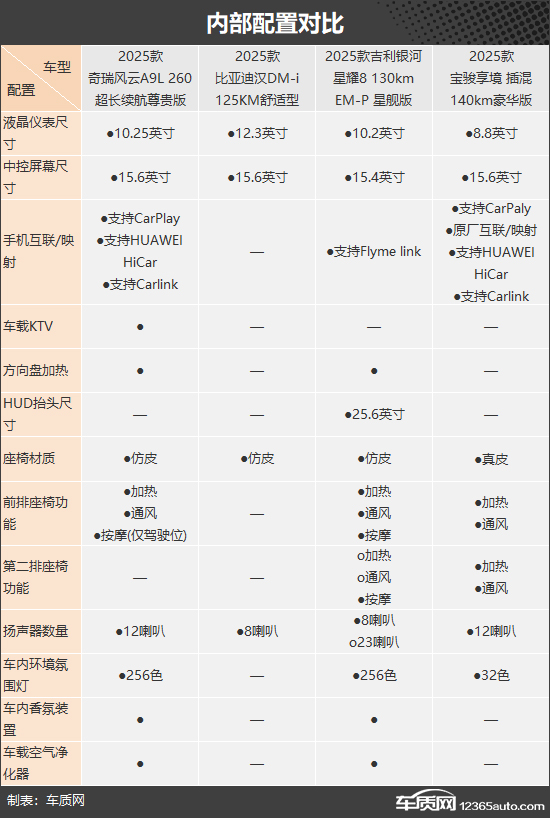 内部配置方面,四款车的中控屏尺寸差异不大,但在手机互联/映射上,宝骏享境 插混有着明显优势,支持4种互联方式。舒适和科技体验上,吉利银河星耀8 EM-P表现十分出众,不仅独享25.6英寸HUD,还标配前排座椅加热/通风/按摩和第二排座椅按摩,且支持选装第二排座椅加热/通风功能。奇瑞风云A9L是唯一支持车载KTV的车型,具有一定的娱乐属性;相比之下,比亚迪汉DM-i的配置丰富程度并不高,与其入门车型的定位有一定关系。