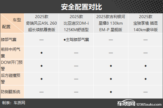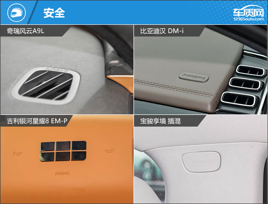 安全配置方面,四款车的基础安全配置悉数配备,但在部分安全配置方面略有不同。奇瑞风云A9L和比亚迪汉DM-i在被动安全上分别独享前排中间气囊、主驾膝部气囊。主动安全配置上,除比亚迪汉DM-i外,其余三款车均配备DOW开门预警、后方碰撞预警,同时,吉利银河星耀8 EM-P还独享防侧翻系统,表现可圈可点。