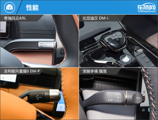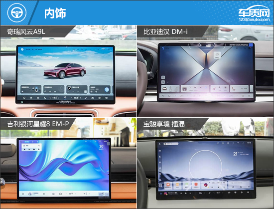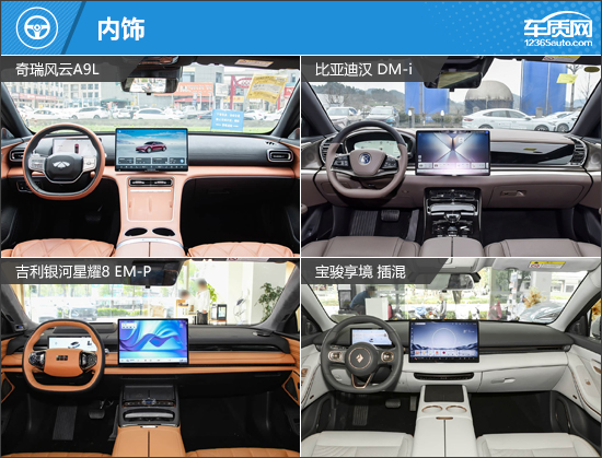 内饰部分,四款车均为简约的设计风格,配备大尺寸中控屏。其中,奇瑞风云A9L和宝骏享境 插混更加强调视觉整体性,将功能集中在了中控屏当中;相反,比亚迪汉 DM-i和吉利银河星耀8 EM-P在中控台区域保留了部分常用功能的物理按键,方便驾驶员盲操作。方向盘造型上,除宝骏享境 插混采用三辐式设计,其余三款车型的方向盘均为双辐式。
