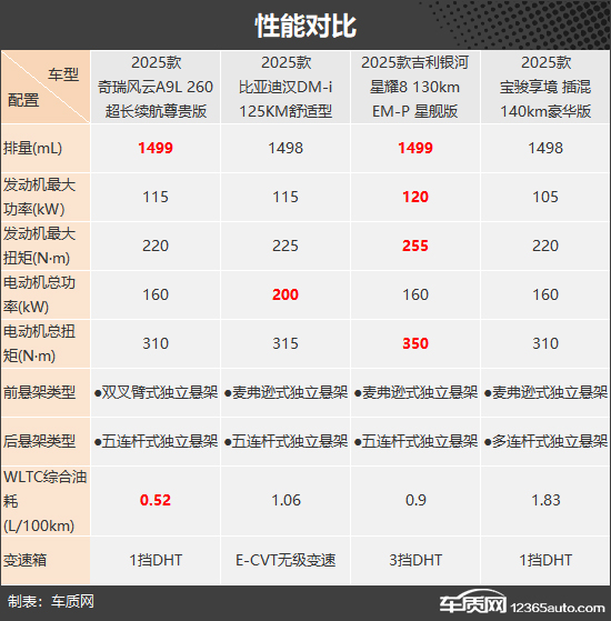 性能方面,四款车均采用1.5T涡轮增压发动机和单电机组成的插混动力系统。动力参数表现最为出色的是吉利银河星耀8 EM-P,在发动机最大功率和最大扭矩,以及电动机总扭矩方面取得领先。底盘悬架类型上,奇瑞风云A9L是四款车中唯一采用前双叉臂式独立悬架的车型,理论上会有更好的操控指向性。油耗部分,奇瑞风云A9L的WLTC综合油耗最低,仅为0.52L/100km。