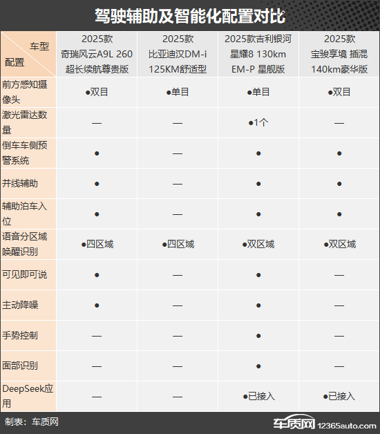 智能化配置方面,奇瑞风云A9L和比亚迪汉DM-i支持四区域语音唤醒识别,吉利银河星耀8 EM-P和宝骏享境 插混仅支持双区域语音唤醒识别。此外,奇瑞风云A9L和吉利银河星耀8 EM-P装备了主动降噪,车内静谧体验更佳;吉利银河星耀8 EM-P独享手势控制和面部识别功能,智能体验更出色。