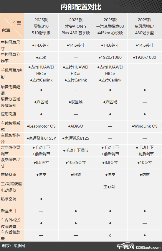 内部配置层面,本次对比的四款车型可以说是“卷”得飞起,无论硬件配置还是功能性,都很难让人相信它们只是售价没有超过10万元的紧凑型SUV。对比来看,零跑B10的整体表现相对更好,不仅中控屏分辨率和车机智能芯片规格更高,语音识别控制系统功能丰富,甚至其还配备了热泵空调。当然,另外三款车型的内部配置也完全对得起价格,基本都能够满足日常使用所需。