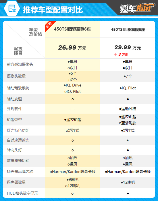 推荐车型为售价26.99万元的450TSI四驱至尊,配置表格对比以6座版车型为例。与高一级别的450TSI四驱旗舰相比,推荐车型的配置表现丝毫不显得寒酸,完全能够满足日常使用所需。更重要的是,较450TSI四驱旗舰版缺失的绝大部分配置都可以通过选装方式得到,因此对于消费者来说,大可不必“一步到位”入手450TSI四驱旗舰,毕竟推荐车型的选择自由度要更高一些。