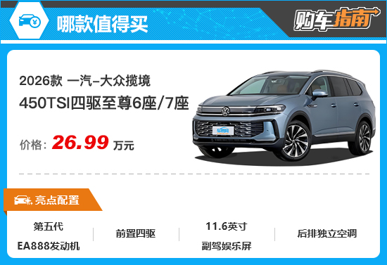 综上所述,对于2026款一汽-大众揽境车型,售价26.99万元的450TSI四驱至尊性价比相对更高,在购买时可以优先考虑。至于6座和7座如何选择,还要根据个人需求来决定。