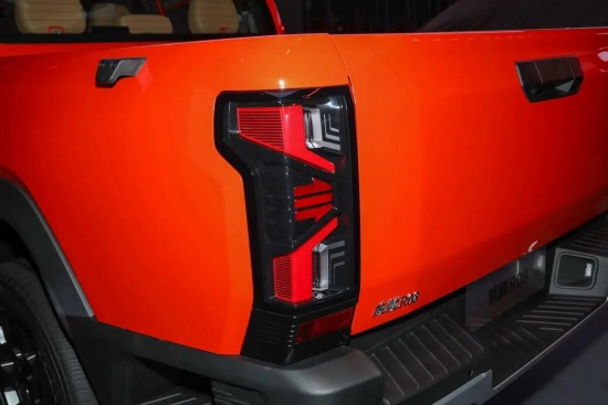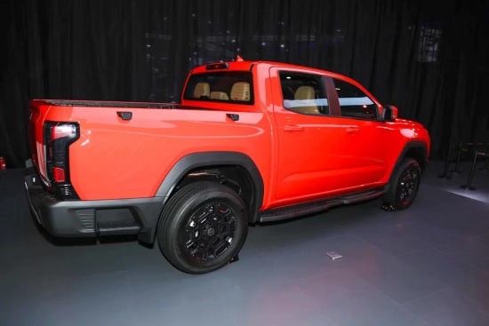 车身侧面为四门双排布局,配备固定脚踏板和防刮塑料包围,既能方便上下车,也能减少日常使用中的漆面损伤。车尾遵循了皮卡车型的经典设计,大面积的矩形货箱门搭配纵向的尾灯,看上去更具运动气息。尾灯采用竖状设计,并进行了熏黑工艺处理,看起来更有设计感。车身尺寸方面,新车有标箱和长箱两种,其中标箱车型长宽高分别为5330mm*1920mm*1890mm,轴距3230mm,长箱车型长度加长至5610mm,轴距3510mm,货箱空间更大,适合重载场景。