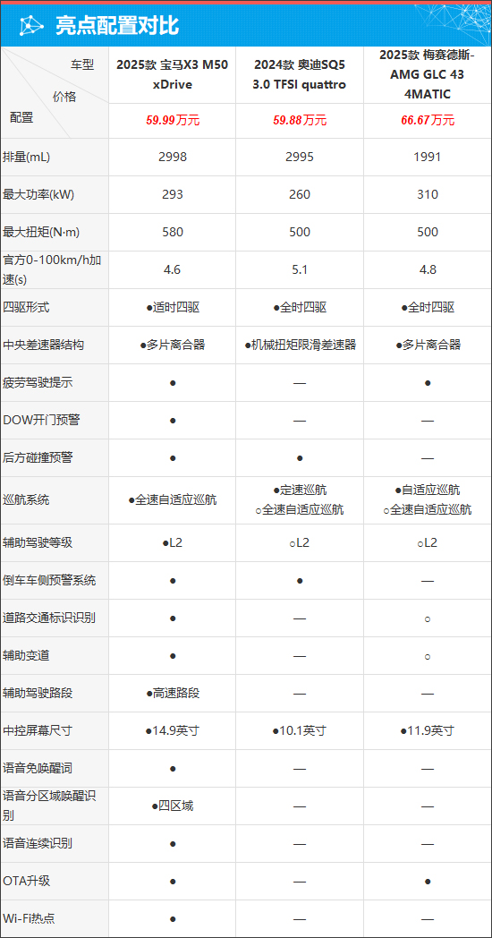 具体到车辆配置层面,通过对比来看,宝马X3 M50的动力参数虽然不是最强的,但却是三款车型中0-100km/h加速用时最少的。此外,在主动安全、辅助驾驶功能以及智能化配置,宝马X3 M50也有着颇为亮眼的表现。