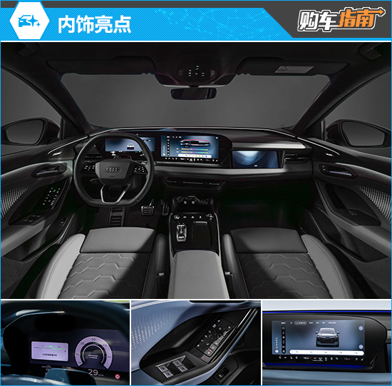 内饰方面延续了奥迪数字化座舱概念,并在此基础上进行升级,加之环抱式布局,彰显出不俗的高级氛围。11.9英寸液晶仪表+14.5英寸中控屏组成的曲面双联屏,搭配嵌入式10.9英寸副驾驶娱乐屏,强化了科技感。配置方面,新车标配前排座椅加热/通风、主动式环境氛围灯、全速自适应巡航以及并线辅助等功能。
