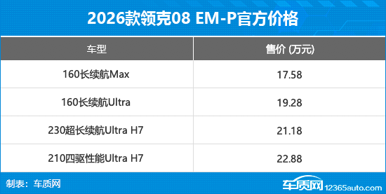 9月24日,2026款领克08 EM-P正式上市,此次共推出4款车型,售价17.58-22.88万元,上市限时价15.98-21.28万元。作为改款车型,新车针对外观、舒适、智能、操控以及安全等多方面进行升级,动力上则搭载1.5T插电混动系统。