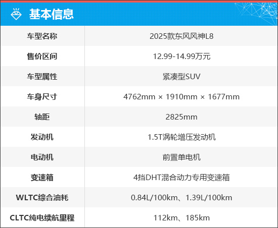 东风风神L8搭载全球首创的4挡电混DHT+ECVT电驱组合,匹配1.5T混动专用发动机,最大功率113kW,最大扭矩240N·m;电动机总功率100kW,总扭矩260N·m。电池部分提供18.1kWh和30.3kWh两种磷酸铁锂电池,CLTC纯电续航里程分别为112km和185km,CLTC综合续航最高可达1412km。此外,新车支持3C快充,并配备6.6kW外放电功能,满足更多元的用车场景。