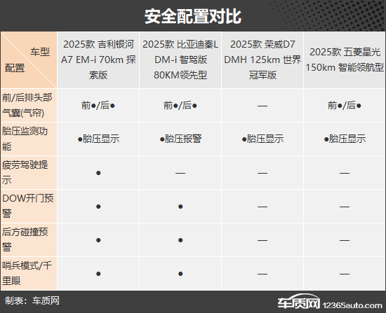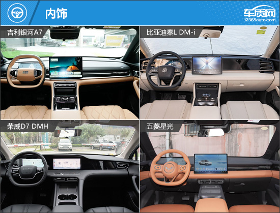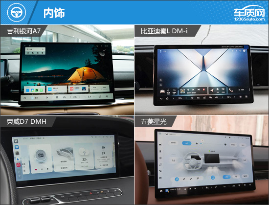外部配置方面,四款车各有亮点。比亚迪秦L DM-i在钥匙类型上最为丰富;吉利银河A7则提供可开启全景天窗选装,由消费者自主选择;荣威D7 DMH和五菱星光配置相对简单,但前者标配了电动天窗,而后者独有的前后排侧窗多层隔音玻璃,在隔音降噪方面表现更佳。