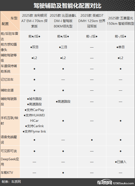 智能化配置方面,吉利银河A7在手机互联/映射上兼容性更高,对不同品牌的手机用户较为友好。比亚迪秦L DM-i则是唯一支持车载KTV的车型,车内娱乐氛围更强。五菱星光接入了DeepSeek应用,与AI智能接轨,功能强大。而荣威D7 DMH的配置则相对单一,与其他三款车型存在了一定差距。
