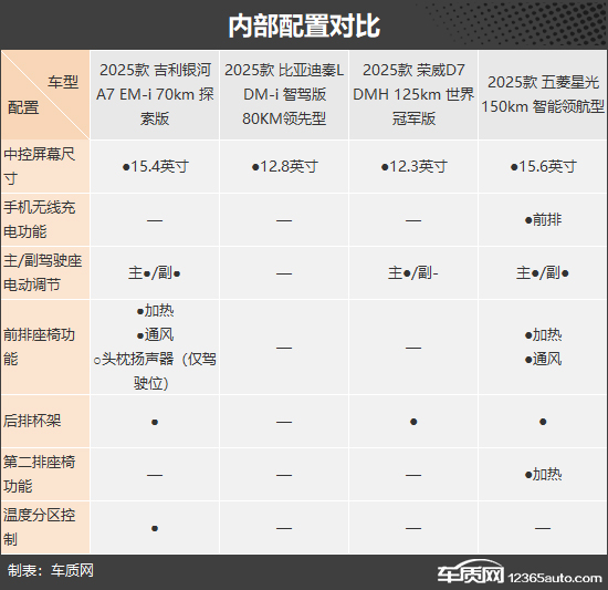 在内部配置方面,比亚迪秦L DM-i的舒适性与便利性配置相对不足,对日常用车体验有所影响。荣威D7 DMH表现稍好,但依旧缺失了一部分重要的座椅功能。五菱星光与吉利银河A7的配置相对全面,但也各有侧重。前者对前后排乘客的照顾更为周到,后者则可选装驾驶位头枕扬声器,并且是唯一支持空调温度分区控制的车型。